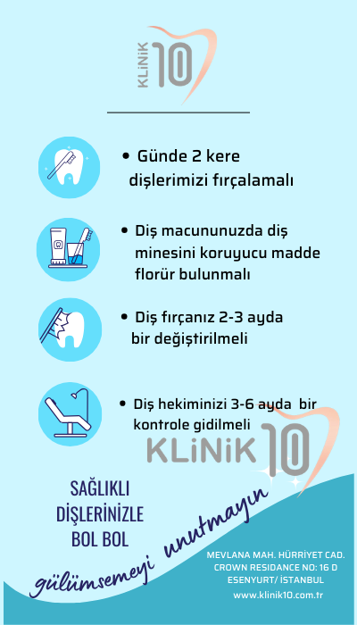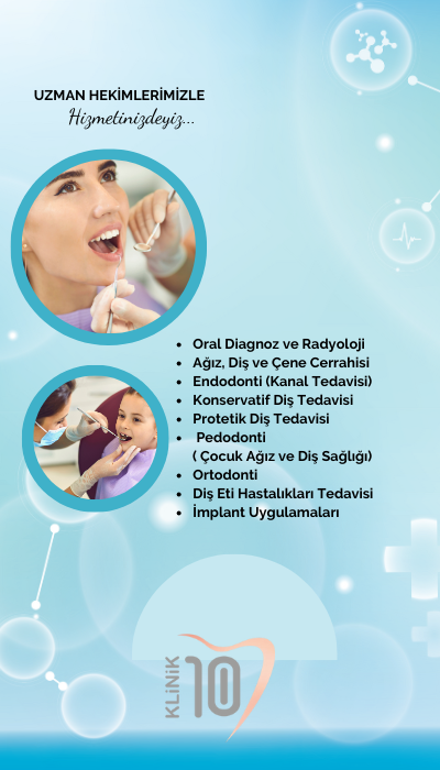 Sağlıklı dişler sağlıklı yaşamın habercisidir. Ağız sağlığında son teknoloji cihazlar ve tecrübemizle hizmetinizdeyiz. Klinik10 Ağız ve Diş Sağlığı Polikliniği olarak önceliğimiz her zaman sizlerin memnuniyetidir. Bu amaç ile sizlere hizmet veriyor ve bundan mutluluk duyuyoruz.